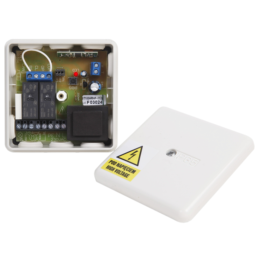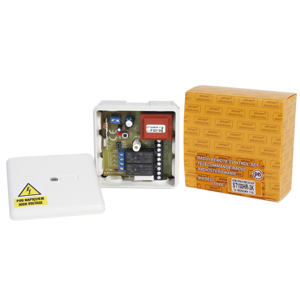 The controller is a modified version of ST100H unit and allows remote switching on-off three 230VAC mains powered devices. These could be lamps, electric inductive motors, power relays, etc. The unit accepts control signals received from Elmes Electronic made KEELOQ® code-hopping key-fob remotes or hand transmitters and features individual or sequential control of its three relay otputs. The unit allows option of outputs wire control by external switches connected to terminals on board of the unit. The outputs may be programmed for latched (on/off) or time-lapse (pulse) operation. In time-lapse operation mode the output will be switched off after preset time ranging from 0,5 second up to 4 hours. Individual control of all three outputs requires the use of four or more channel Elmes Electronic hand transmitters, e.g. CH4HT, CH3NT, CH8NT, CH8HT, CH32HT, STX. Using only one or two channel transmitters learned to the unit allows sequential control of the outputs. The maximal number of transmitters learned to the unit is 112. Power relay outputs with hermetic panel housing and wide operating temperature range of used superheterodyne receiver module allow variety of application fields of the unit and installation in and outdoors. The ST100H3K does not include keyfob transmitters, which should be ordered separatelly.
